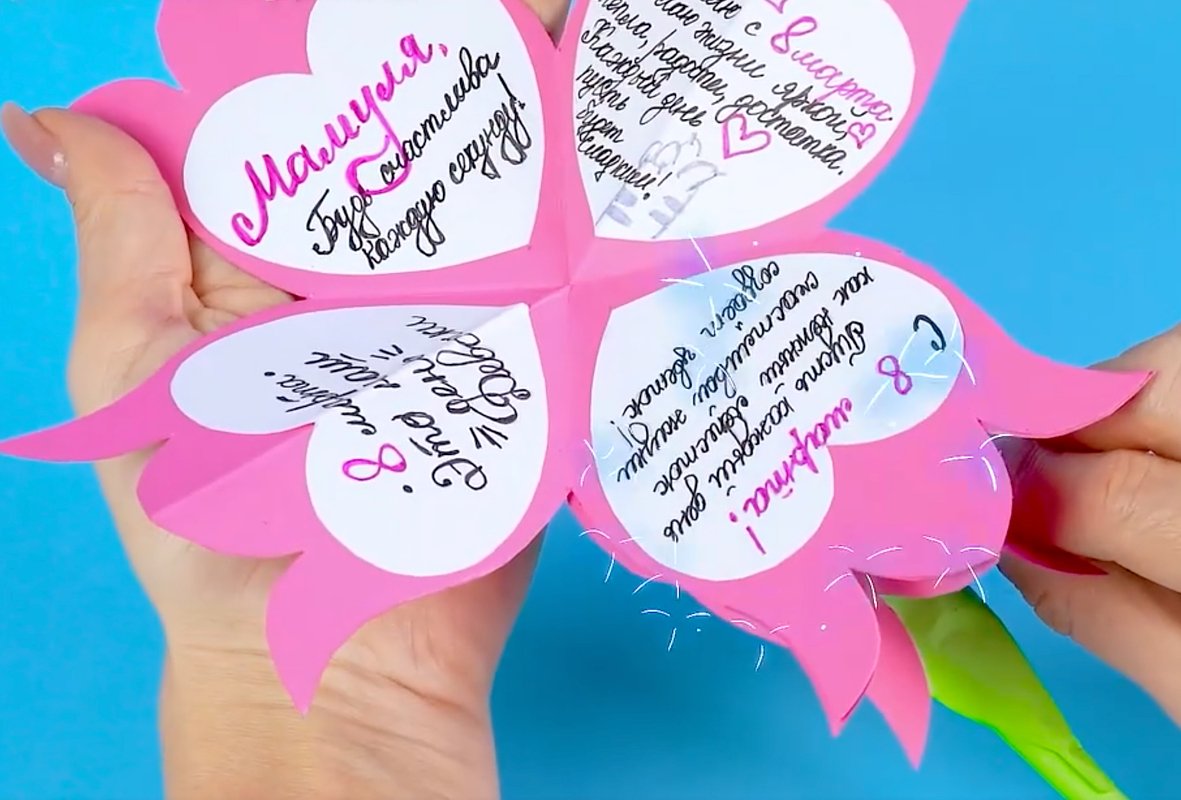 Цветок с пожеланиями внутри — оригинальный способ преподнести и красивый букет, и теплые слова. В отличие от настоящего букета, яркий бумажный цветок не завянет и будет долго напоминать о празднике. Кроме того, это отличный вариант для детской поделки.