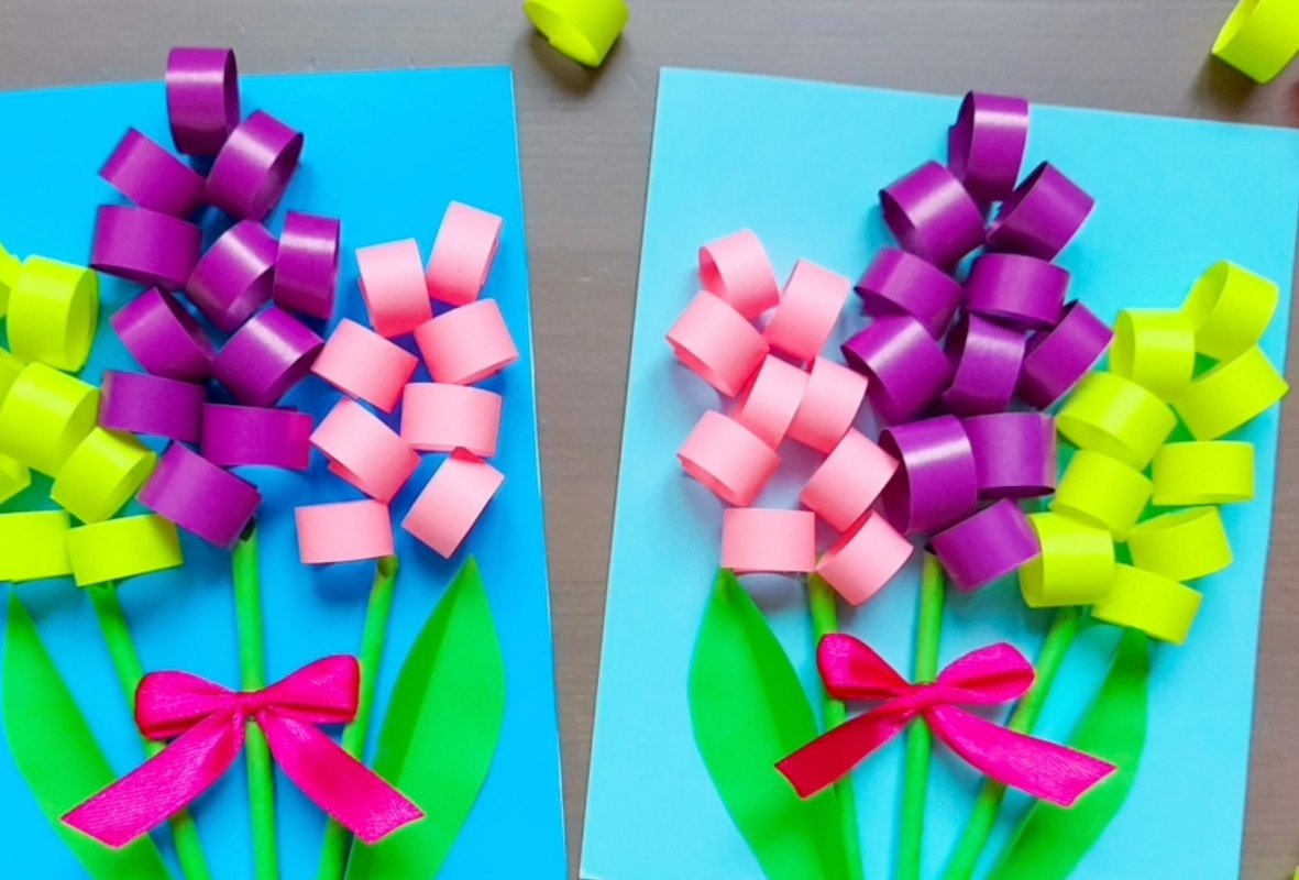 - Разложите из этих кружочков на картонной основе три цветка — это могут быть тюльпаны, розы, гиацинты или любые другие цветы. Когда результат понравится, приклейте заготовки.