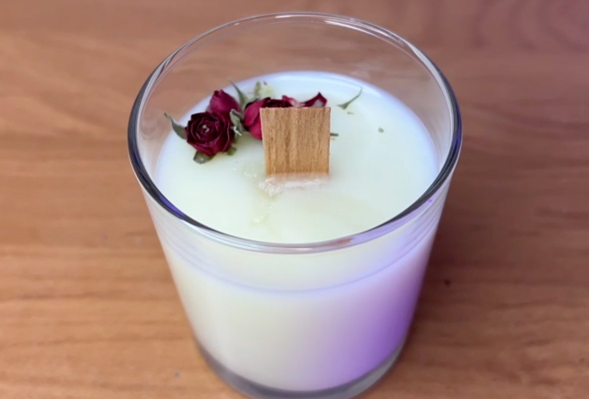 Ароматная свеча — это маленький кусочек весны, который можно зажечь прямо у себя дома. Внутри прозрачного стаканчика застыли настоящие цветы, а деревянный фитиль горит с тихим треском, как настоящий камин. В качестве емкости можно использовать не только покупные стаканчики, но и, например, пластиковую чашку или необычную баночку.